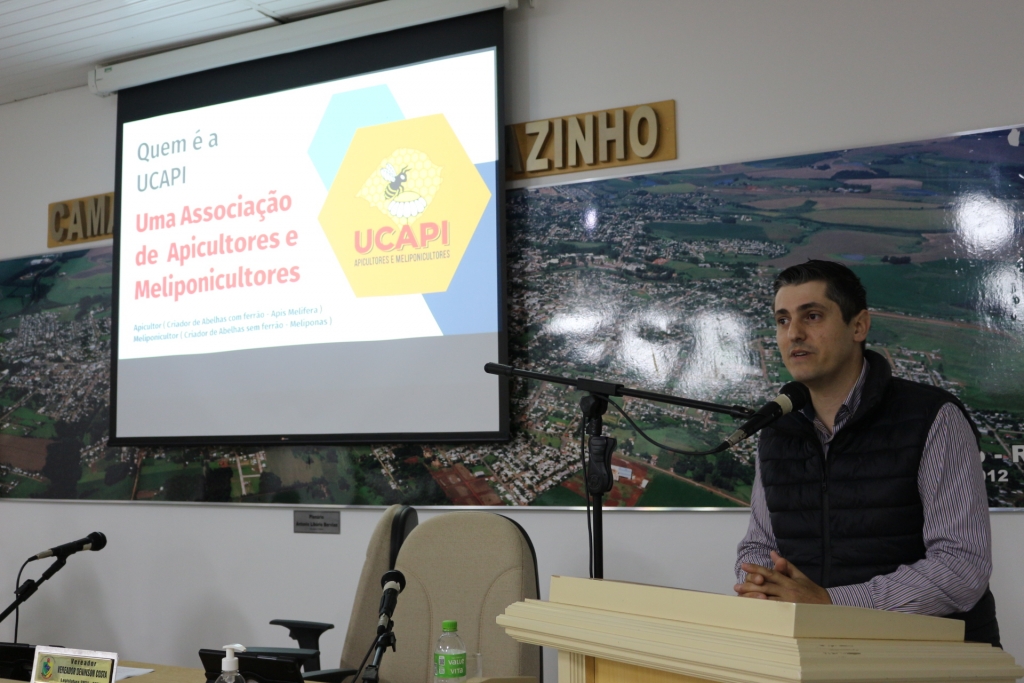 A primeira delas foi a União Carazinhense de Apicultores e Meliponicultores (Ucapi). O secretário da Ucapi, César de Souza, fez uma breve apresentação da história da associação, que completa 23 anos. Com a missão de unir a cadeia produtiva das abelhas de forma associativista, a Ucapi abrange 91 apicultores (criadores de abelhas com ferrão) e 102 meliponicultores (criadores de abelhas sem ferrão).